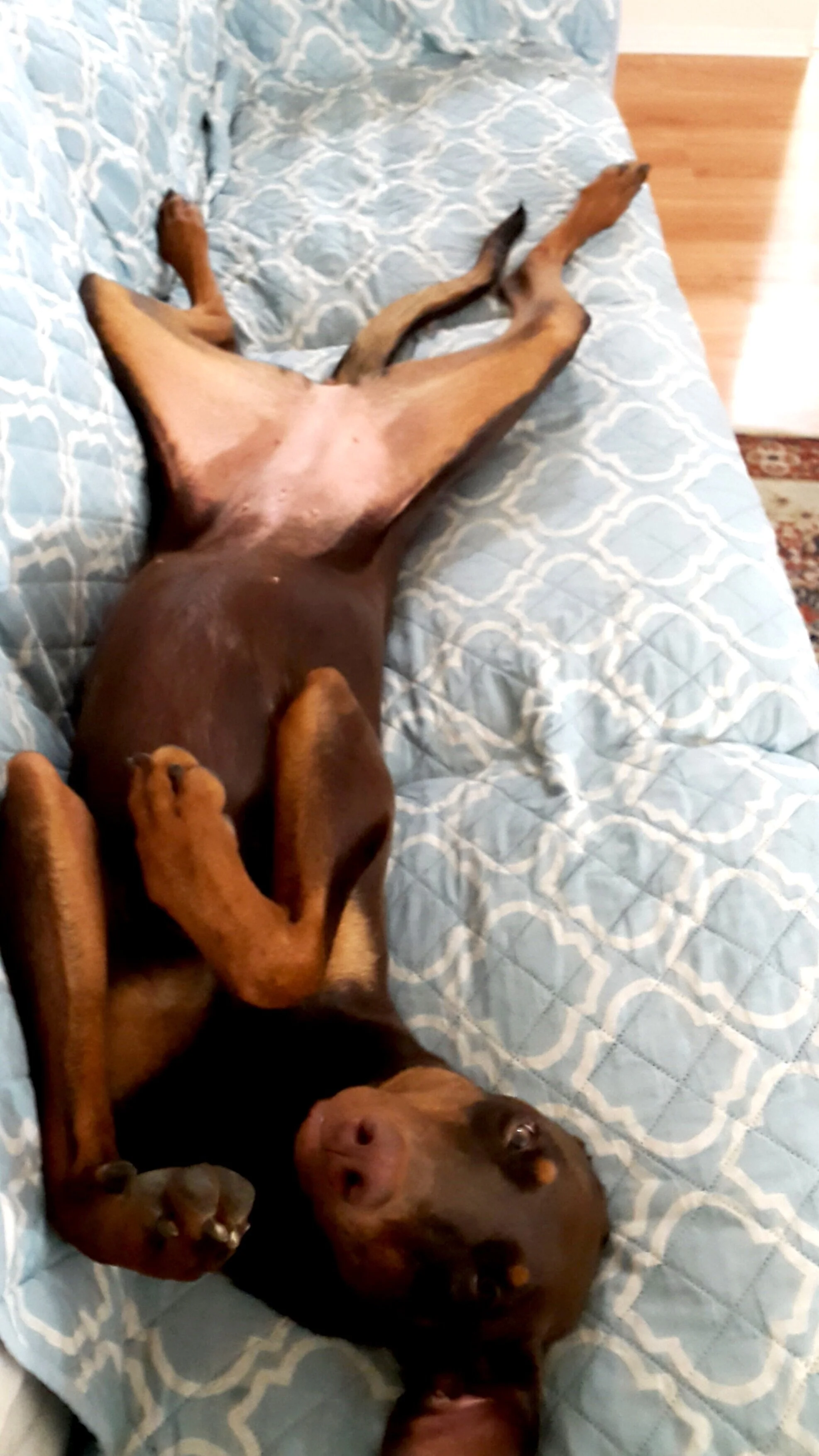Our Dobergirl wasn’t as lucky. When she went after the raccoon, her chest got rip open. Since we lived out in the country and there's no veterinarian service close by, and our normal vets would not be opened until the next day, I had to take care of her for the night until she could go and get stitches the next day.